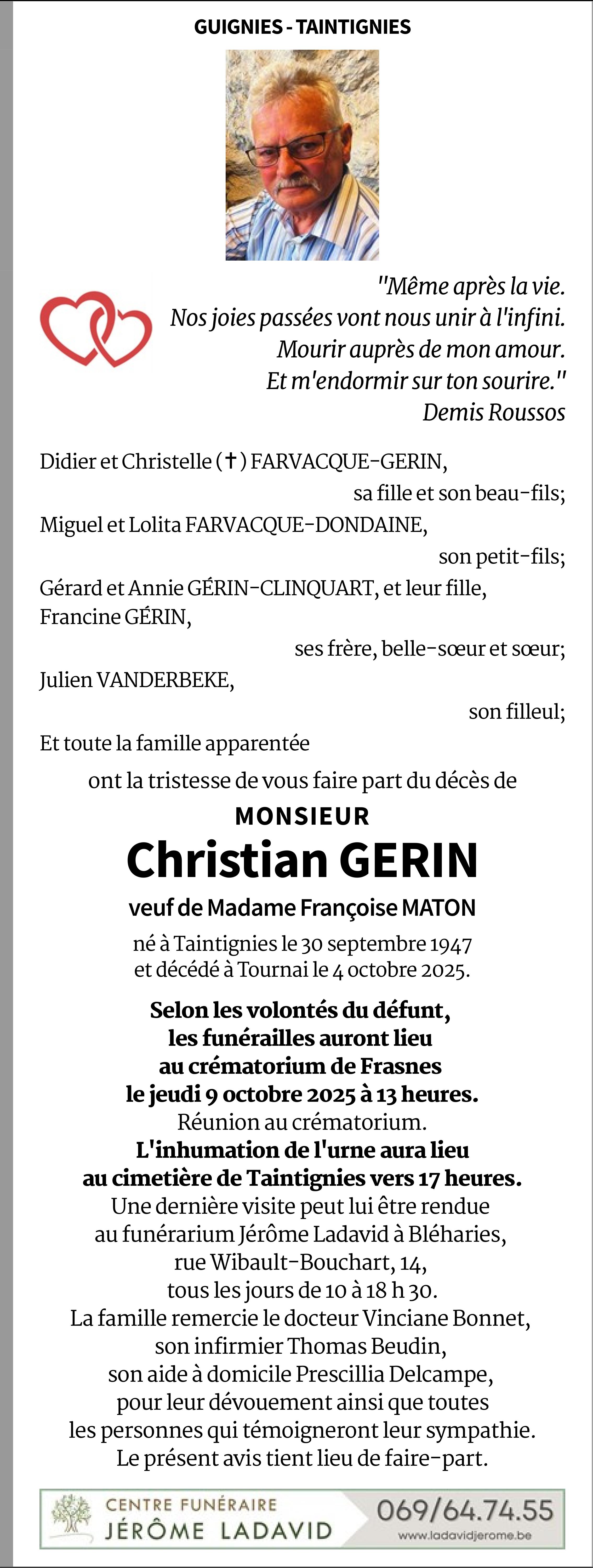 {"name":"Monsieur Christian GERIN","caption":"De 30\/09\/1947 \u00e0 04\/10\/2025","description":"Consulter l'avis de d\u00e9c\u00e8s sur le site \"En M\u00e9moire\"","link":"http:\/\/enmemoire.sudinfo.be\/\/annonce\/056656191759694741\/gerin-christian","portrait":"http:\/\/enmemoire.sudinfo.be\/sites\/default\/files\/mediastore\/imagecache\/small2\/"}